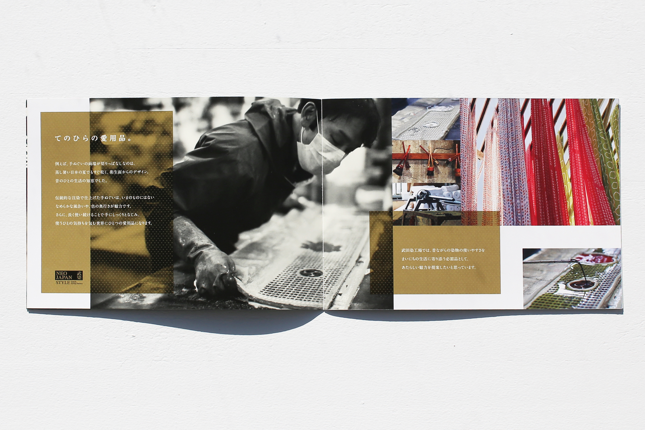 コンセプトブックでは「300年と1日。伝え続けるものたち。」のメッセージを冒頭に、武田染工場の主要商品である手ぬぐい、帆前掛けの案内の他、今では希少な伝統染色技法となった「注染(ちゅうせん)本染め」「硫化染め」をご案内しています。また、染色について工程の紹介も添えて、昔ながらの染物の使いやすさや、職人の手で一枚ずつ染め上げられる深い色合いといった、生活に寄り添う染めの魅力を発信した内容になっています。(以下、コンセプトブックより)どんな老舗も、心を尽くした1日の積み重ね。私たちはそれを大切に、目まぐるしく変わる時代のなかでひとつひとつ、職人の手をかけた昔ながらの染色法「注染」と「硫化染め」にこだわり、先人の想いと向き合う本物ならではの素晴らしさを、いまに伝え続けています。老舗の使命を、今日という1日に込めて。ふるさと仙台の誇りとともに。